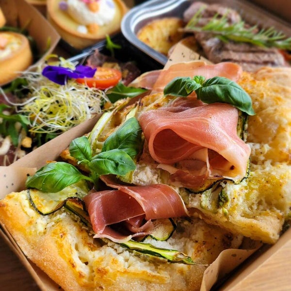 🌸Pinsa met crème fraîche, groene asperge, courgette en Serranoham